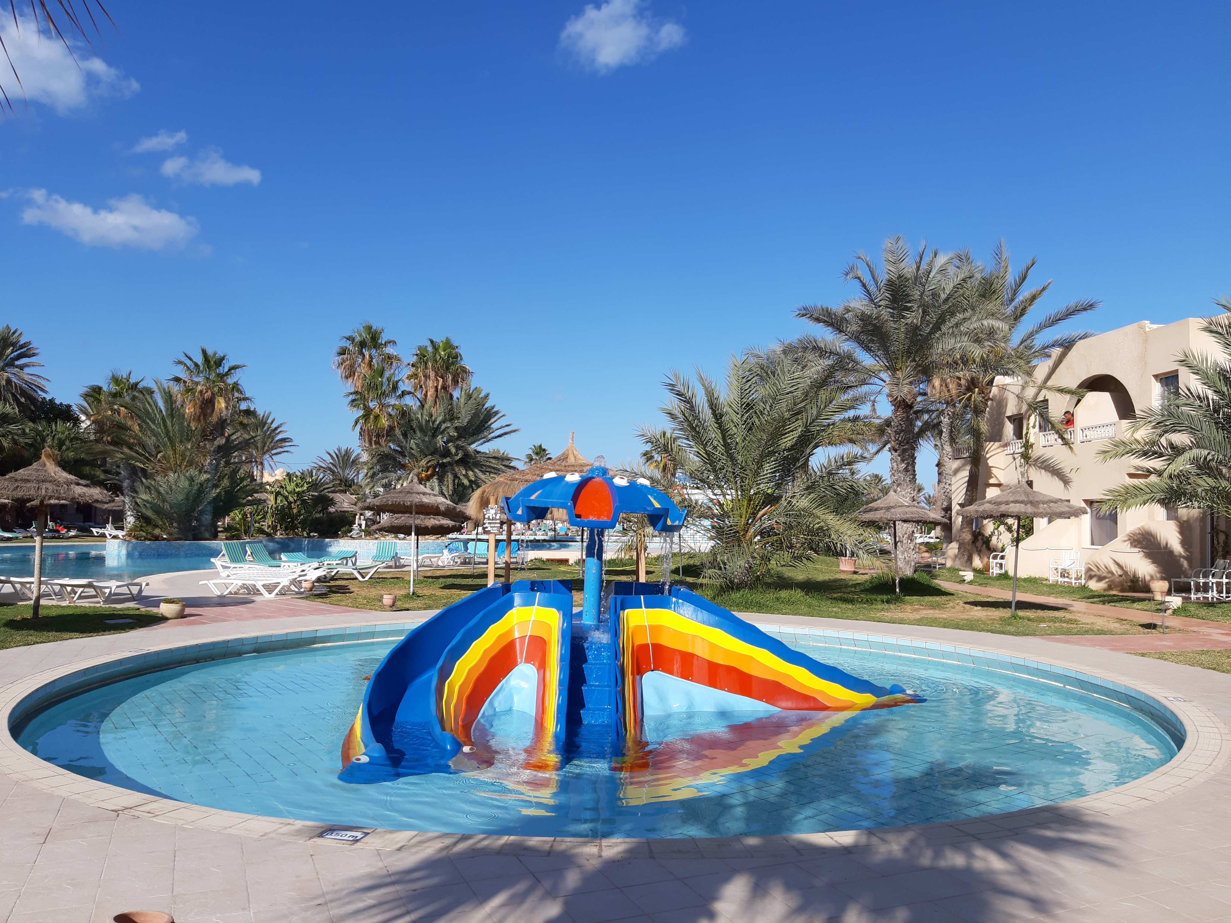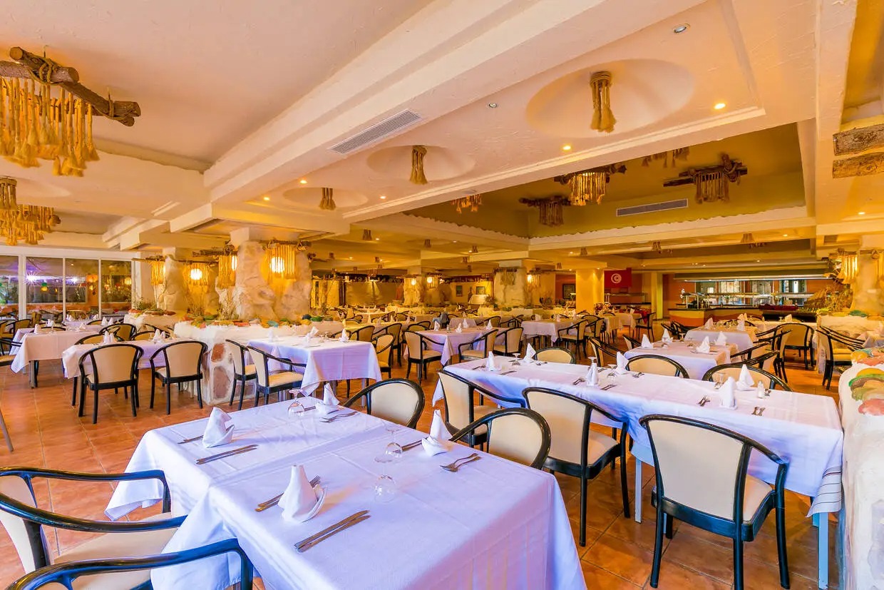 Основен ресторант, 5 а-ла-карт ресторанта (тунизийски , рибен ,марокански, ливански , средиземноморски – срещу заплащане/с предварителна резервация, съгласно концепцията на хотела/1 безплатно посещение на 1 от ресторантите при минимум 7 нощувки), 3 бара, мавританско кафене (срещу заплащане), открит басейн, 3 водни пързалки, закрит басейн (от 01.11 до 31.03), закрит басейн с морска вода в Таласо центъра (срещу заплащане), 2 конферентни зали и заседателна зала, магазин, обмяна на валута, денонощна рецепция, Таласо център.